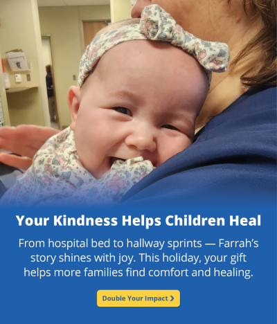 A year ago, Farrah lay in a hospital bed with only the steady beep of her monitor to measure hope; today, she’s sprinting down the hallway. This holiday season, your gift can have twice the impact thanks to a generous match, helping more families find comfort, hope, and joy.