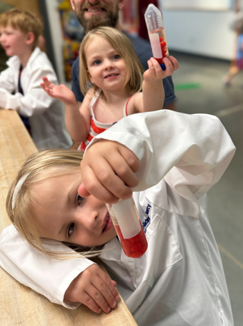 Participants in Science Days are referred to as “junior scientists” as they work through their own scientific experiment. A popular experiment explored precision medicine and how the Genomic and Ontogeny-Linked Dose Individualization and cLinical Optimization for Kids (GOLDILOKs) initiative at Children’s Mercy is personalizing medicine to meet the unique needs of each child. To better understand why finding the right dose is important in medicine, children explored how adding different doses of activator while making slime resulted in undesirable or ideal reactions. Similar to the balancing act of dosing medication, if a junior scientist added too much or too little activator (contact lens solution) to a mixture of water and glue, the slime would have unwanted side effects like becoming unusually stiff or runny. The act of carefully measuring the slime activator parallels how a dose of medication that is too low or too high for an individual child may lead to unwanted side effects.