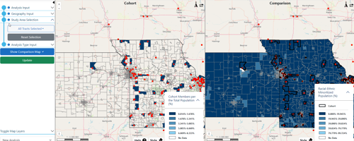 By using the geocoded data produced by GeoMarker, SCALE can create visualizations of patient cohorts and social determinants with side-by-side mapping, including information like the child opportunity index, race and ethnicity details, income data and more. The tool can also automatically generate a summary table of cohort data alongside publicly available data for those indicators, giving researchers a more accurate view into how well-represented the various demographic groups are in their own data sets. Users can toggle layers on and off, change colors on the map, export visuals, and more.