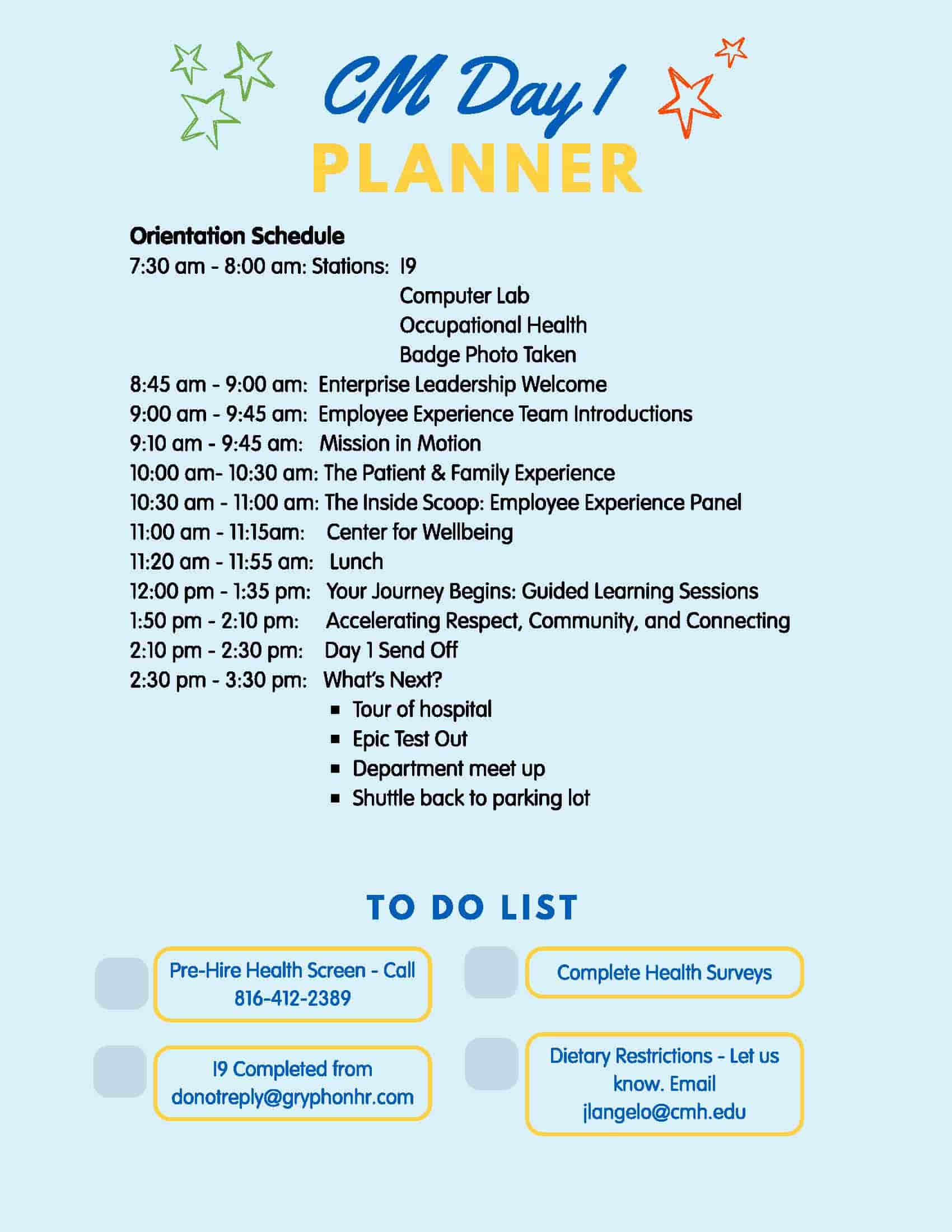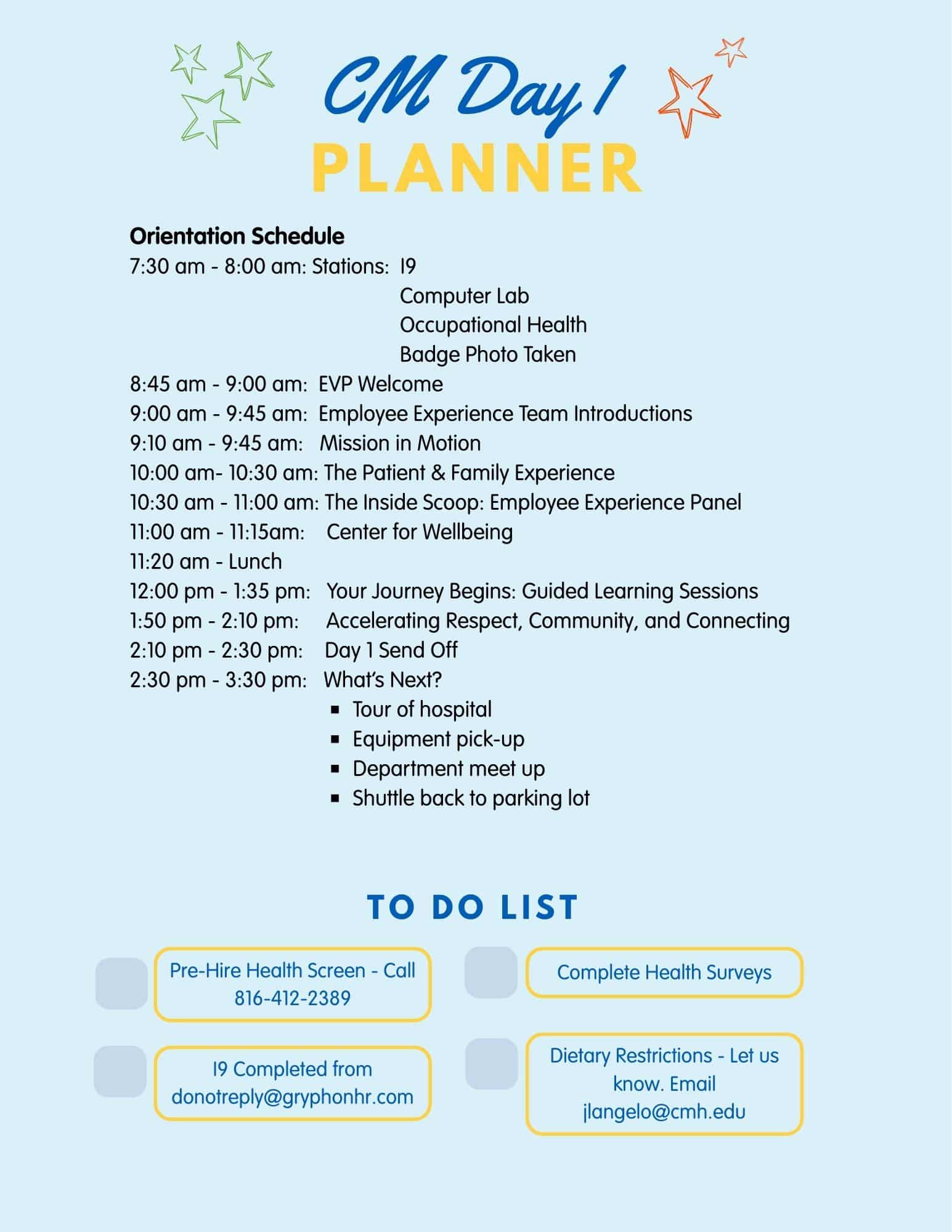 At the end of the orientation day, we will ask all attendees to complete a brief survey so we can continue to provide the best CMO experience for future new hires.