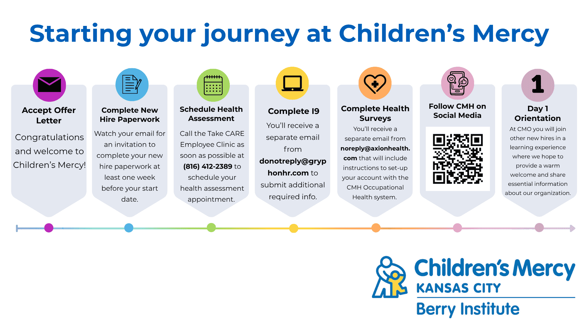 Hello, and welcome to Children’s Mercy. We’re really excited you’re joining our team of 8,500-plus employees. You’ll soon notice that everyone here is dedicated to helping kids meet their potential every day. It’s a great vibe to be a part of! Here’s some information on what to expect after you accept your offer.