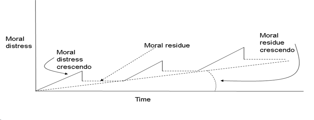 All HCPs need to be able to identify their distress and seek some improved coping skills and means by which they can achieve resilience to continue in their service-oriented professions. Not doing so can lead to unmitigated moral distress that affects HCPs physically, behaviorally, emotionally, and spiritually, as well as possibly causing them to leave a profession that they have trained for and love. Epstein and Hamric described the Crescendo Effect of Moral Distress (illustrated in the diagram below) that transpires over time, leaving moral residue behind each time moral distress occurs and is not mitigated, resulting in a heightened experience and symptoms with each successive occurrence.2