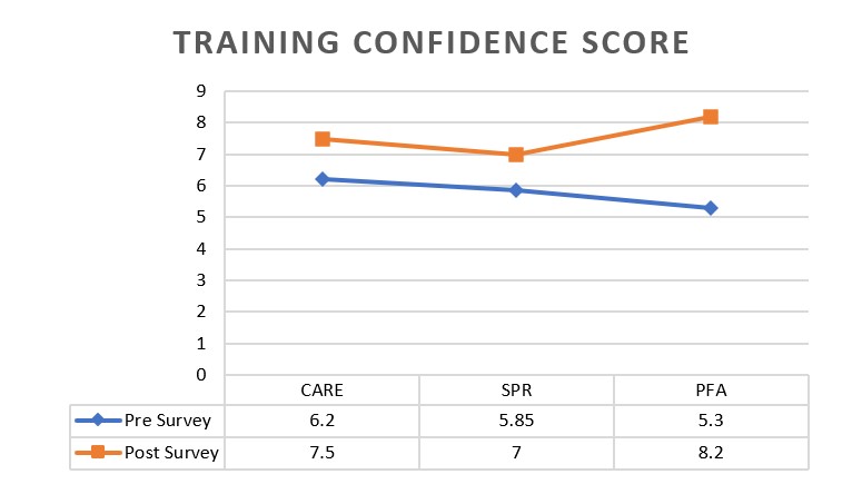 For the next year, and with the support of the Pediatric Pandemic Network, a federal cooperative agreement designed to improve health outcomes of children and the resiliency of children, families and communities impacted by emergencies, disasters and pandemics, Children’s Mercy created access to free trainings for hospital and community members on DMH (e.g., Psychological First Aid, Stress First Aid, Skills for Psychological Recovery, Respond with CARE, Trauma-Focused Cognitive Behavioral Therapy, Acute Trauma-Focused Cognitive Behavioral Therapy). Efforts reached 87 community partners from varied organizations (e.g., Certified Community Behavioral Health Centers, private mental health, health care, school districts, public health, government offices, child welfare, community social services and court systems). Participant caregivers included 282 people from 77 different organizations attending at least one of the trainings within six months. Participant confidence levels increased pre- to post-training as assessed by the question, “What is your current level of confidence in supporting the mental health of children and families impacted by a disaster?” (Figure)