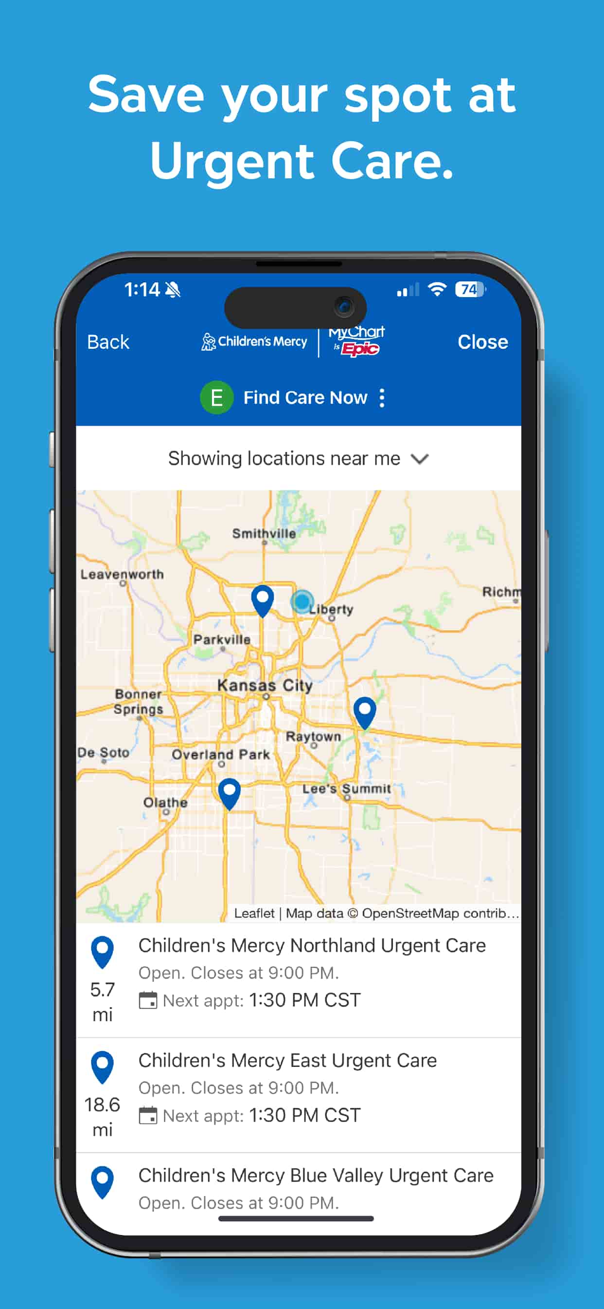 Find the nearest urgent care location, see wait times and save your spot in line, all without leaving home. Make the living room your waiting room: We’ll text you when to head in for your scheduled time.